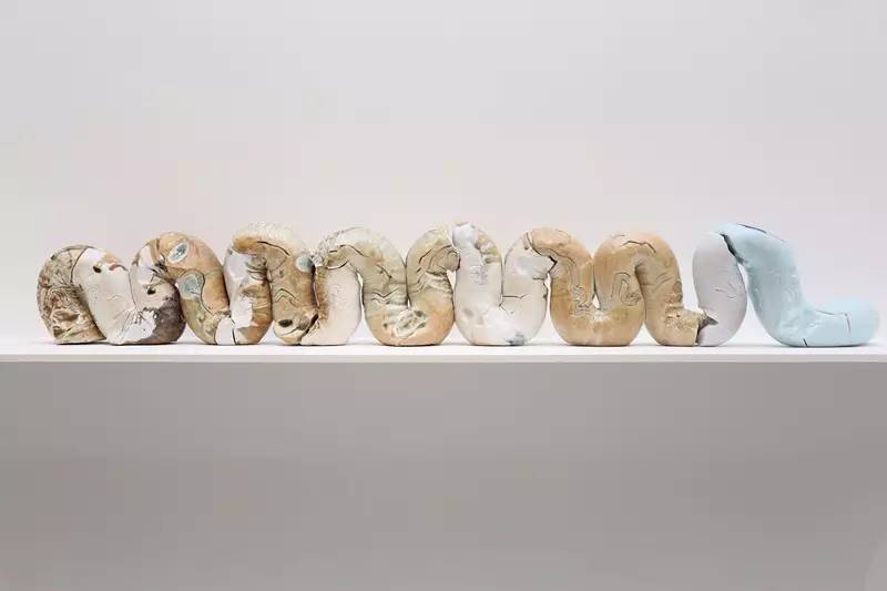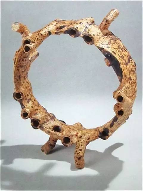 八木一夫,《萨姆萨先生的散步》,他这件作品也是1954年。世界文明永远是融合吸收改造呈现的历史,八木一夫为什么会做这样一件作品,萨姆萨先生是卡夫卡的小说,《变形计》里面的主人公。这个小说我读过几次,年轻的时候读过,前年,我再读的时候真是感受不一样。人换一个年龄去感知同样的东西,过去的自己真是太浅薄、太没文化。我现在还常常去读小王子,每一次读都感动的一塌糊涂。一个文学家用文字编织的一个世界,可以从一个大陆的大洲影响一个岛国的艺术家,八木一夫就是因为看了《变形计》然后做了这件作品,完全颠覆了日本这样一个非常传统的陶瓷艺术的国度。他用的方式是拉坯、相接、柴烧的元素、技艺、烧成都是传统的但是形态却极为现代。