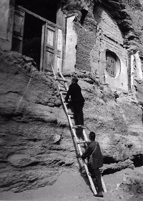 1942 年时的莫高窟,常书鸿先生爬梯子进窟