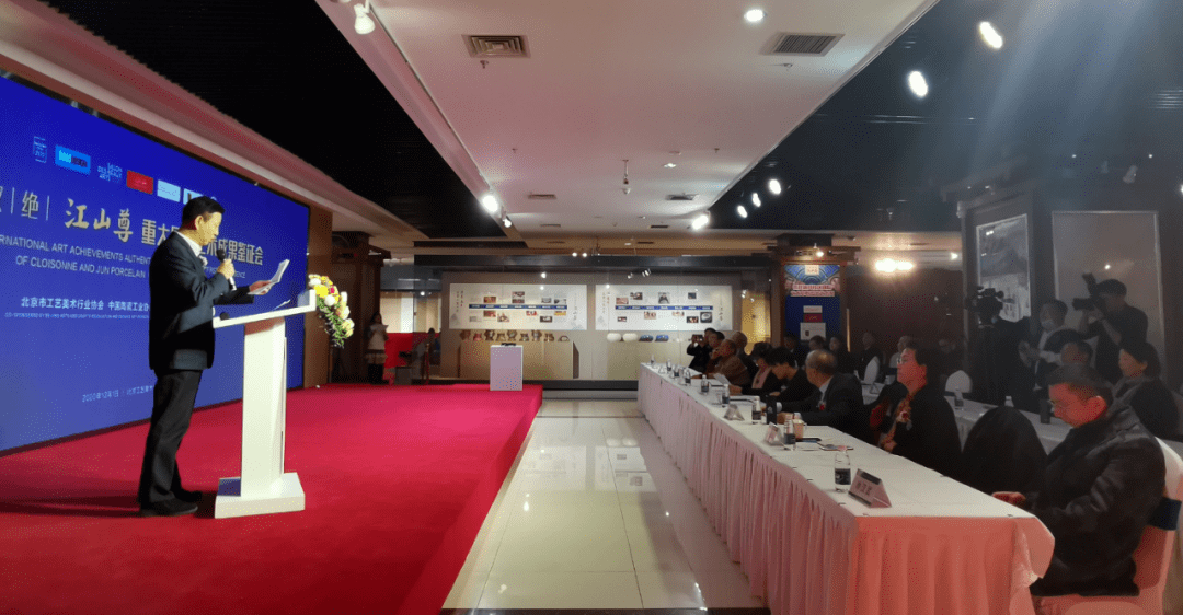 2020年12月1日,“景钧双绝·江山尊”重大国际艺术成果见证会在北京工艺美术博物馆召开。由中国工艺美术大师霍铁辉与中国陶瓷艺术大师晋晓瞳多年摸索并最终完成的景泰蓝与钧瓷双剑合璧作品“景钧双绝·江山尊”现场进行了展示,有关专家对作品给予了高度评价。