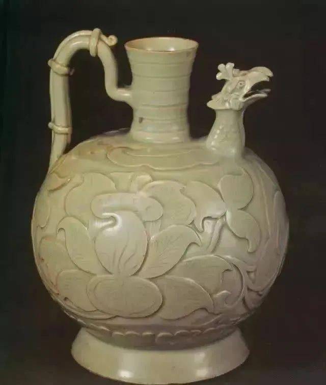 五代末 青釉雕花双凤流执壶 高20.5厘米