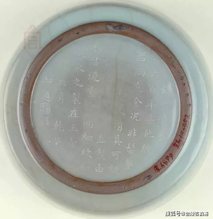 底面镌刻乾隆皇帝〈咏官窑葵花盘〉:「脩内陶秘器,官窑异外间。难分建隆代,总出凤凰山。葵式全非赭,冰纹半染殷。倾阳如取譬,切已独思艰」御製诗。