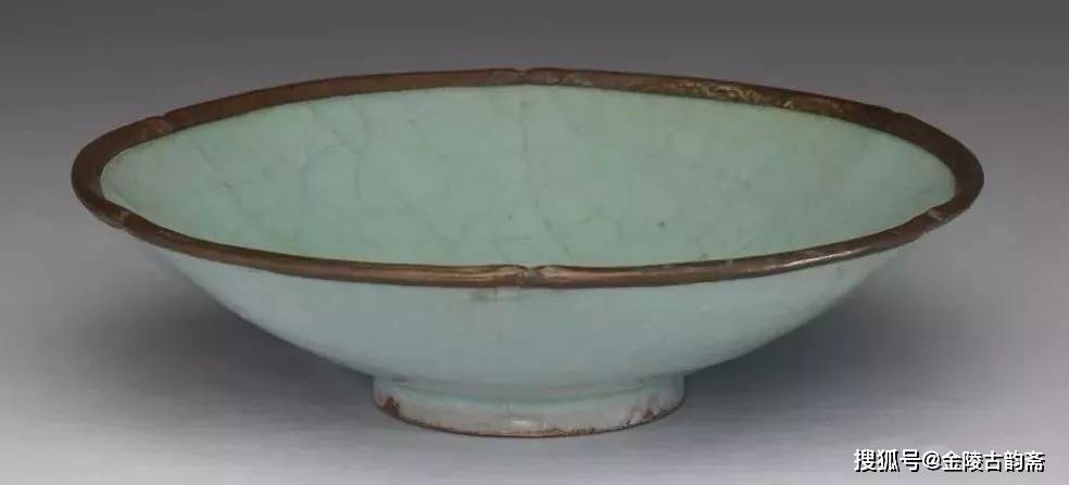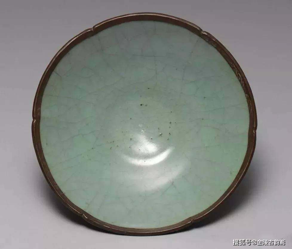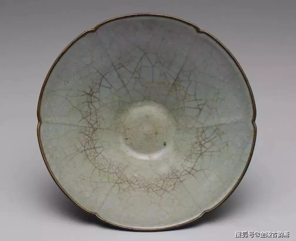 模制成形,圆口,口沿镶镀金铜边,浅壁,矮圈足。外壁模饰菊瓣三十五稜,满釉支烧,通体满施粉青色釉,釉质清亮浓稠。釉表满佈棕色纹片,局部可见冰裂纹。底週排佈七枚支钉,支痕中露出深灰色器胎。