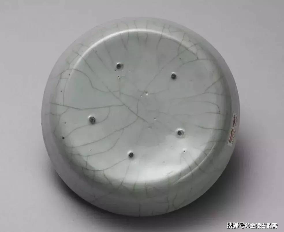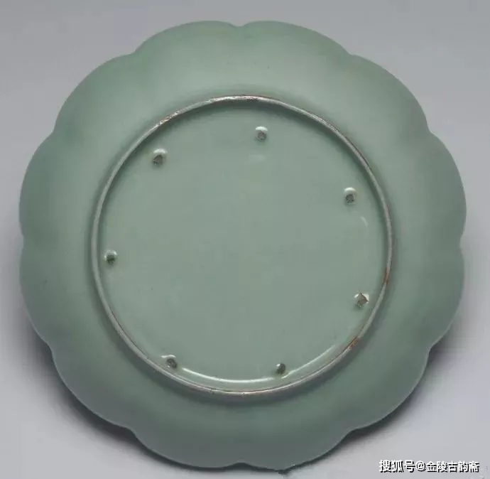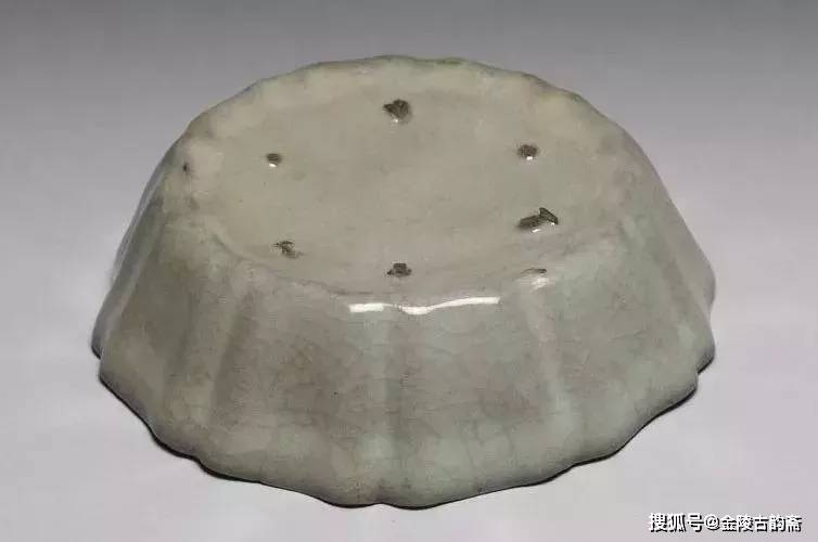 综观南宋官窑花口洗,造形样式虽有个别变化,但多半具有金属器的风格,从中并且可以归纳出足径一般介于9-13 公分之间,底面沿边排佈的支钉有七或八枚两种群组。