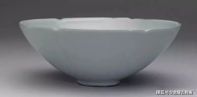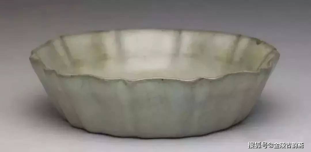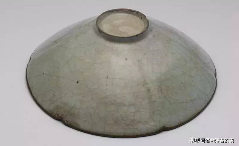 花口分六瓣,侈口,弧形深壁,器外微现六道浅沟,内底心凹陷一圆形浅槽,圜底,浅圈足。垫烧,内外施青釉,釉层浓润,颜色粉青,口下局部刮釉,露出多层施釉特徵,釉表带少许棕色大纹片,圈足施釉不匀整,局部显露出深灰色的胎体。器形类似大英博物馆收藏的「亚历山大碗」。
