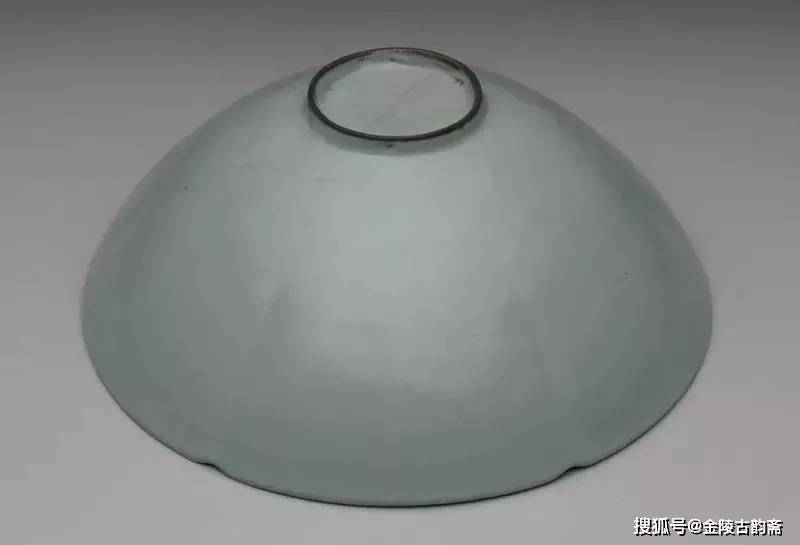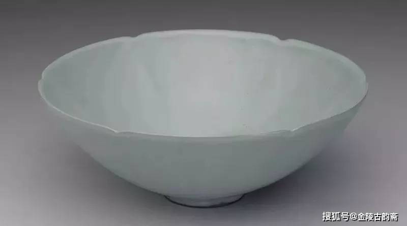 花口分六瓣,侈口,弧形深壁,器外微现六道浅槽,内底心微凹陷,圜底,浅圈足。垫烧,内外施青釉,釉层浓润,颜色粉青,口下有多层施釉痕,釉表带少许棕色大纹片圈足施釉不匀整,著地处露出深灰色胎器形类似大英博物馆收藏的「亚历山大碗」。