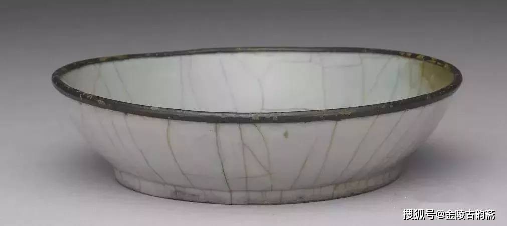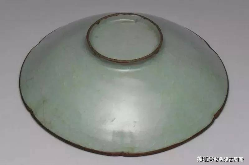 圆侈口,口沿加镶铜边。浅壁,平底,浅圈足。胎体较薄,採支、垫并用方式装烧,内外施青釉,釉色偏灰,釉面满佈棕色纹片,底面沿边排佈七枚支钉,足端与支痕均显露出灰黑色器胎。