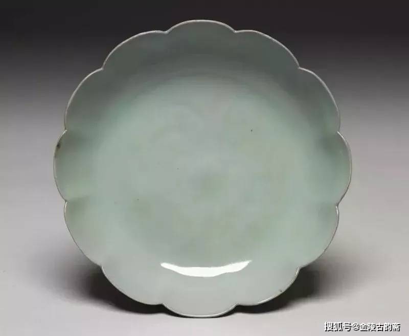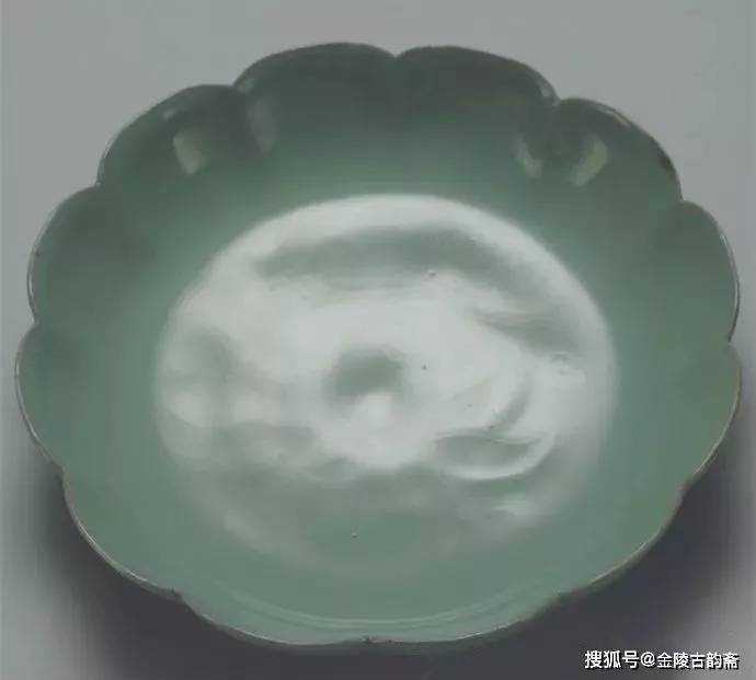 六瓣葵口折腰盘,浅壁,浅圈足,盘心微凹,圈足低矮。採垫烧法烧製,内外施青釉,釉色偏绿,器表开棕色纹片,间杂少许细碎冰裂纹。外壁顺应葵口出现六道浅槽,圈足施釉不匀整,著地处露出灰土胎色张公巷窑址也见有相似的标本。