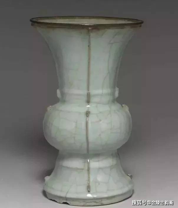 簋形器,呈椭圆形,口缘下有二道凸弦纹;腹圆鼓,矮圈足,足圈外移。双附耳的垂珥已被磨去,露出深褐色胎。附耳作立兽形,半环状兽身中空。全器釉色粉青,厚腴,微有流动性。稜线处呈显胎色。六角形的纹片多半无色,为俗称之冰裂纹。另有浅黄色的大纹片,为鳝血纹。足圈内侧多缩釉。口沿及足圈均镶铜釦稜。