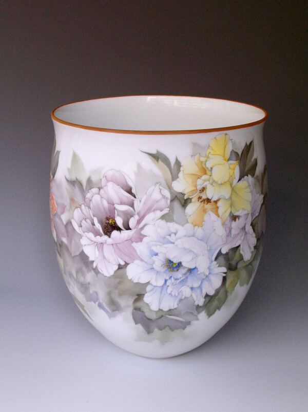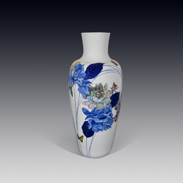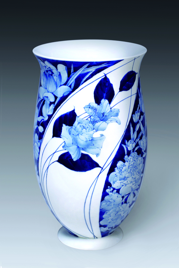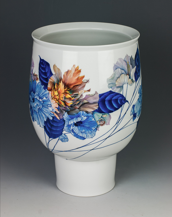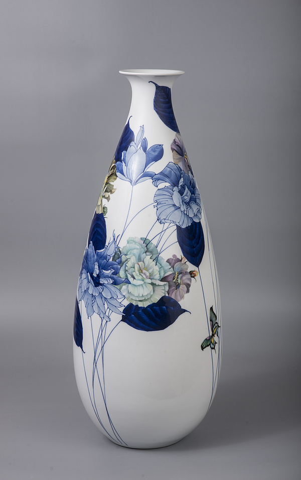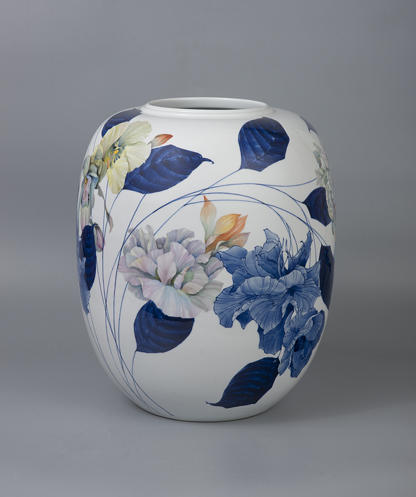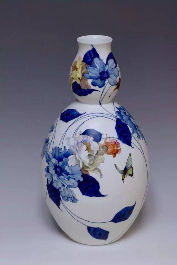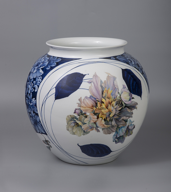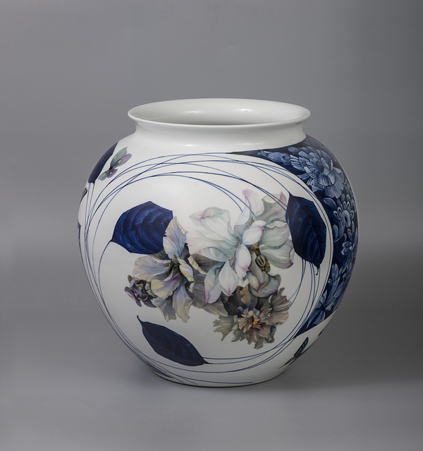 《对话》作品实为全国乃至世界陶瓷史上首创的陶瓷装饰艺术新形式和新品类。通过高温釉下青花与低温釉上珐华彩、素雅青翠的青花与流光溢彩的珐华、釉下彩绘技艺与釉上沥线填釉工艺多层次的工艺对话,极巧妙地凸现出陶瓷综合彩的特色和艺木魅力。