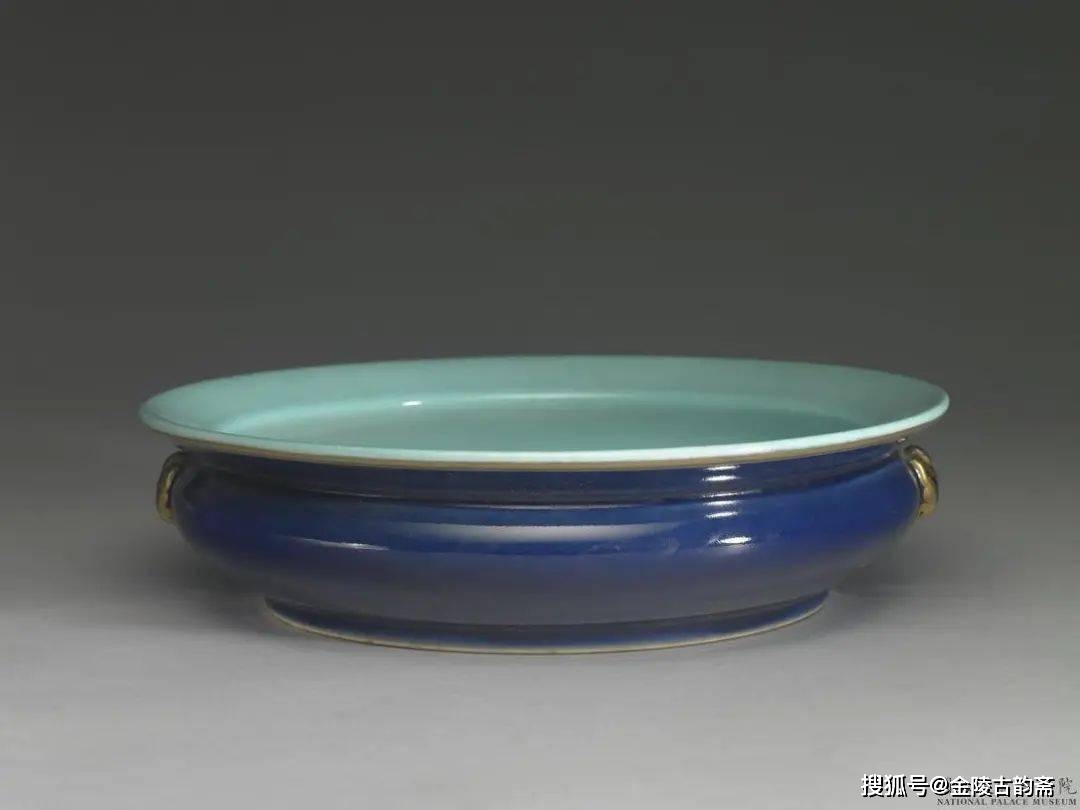 高6.7厘米,口径27.3厘米,底径19.3厘米。敞口,弧壁,鼓腹,腹侧贴饰描金兽面衔环,浅圈足。口沿施一圈金彩,足沿露胎。器表施霁蓝釉,色泽深沉浓厚,光亮细腻。器内及底施蓝绿釉,呈色青绿,柔和悦目。器底有“大清乾隆年制”六字三行篆书方章印。