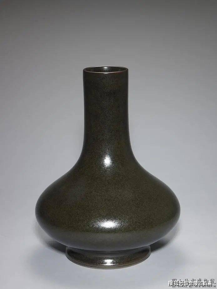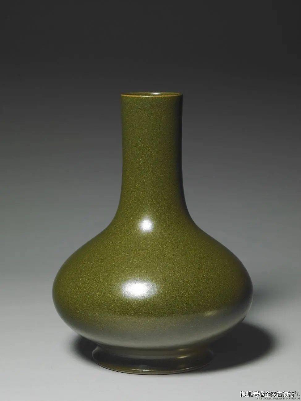 高32.厘米,口径7.2厘米,足径15厘米。圆口,长直颈,硕腹,圈足外撇。外壁满施茶叶末釉,呈色浓绿。足缘露胎一圈,足内满釉,中心釉下印“大清乾隆年制”三行六字篆款。所谓茶叶末釉,是一种高温色釉,其呈色往往绿黄交融,这与唐英《陶成纪事碑记》中对“厂官釉”的描述有:“鳝鱼黄”、“蛇皮绿”等描述似可对合,所以研究者也将这种釉名为“厂官釉”。