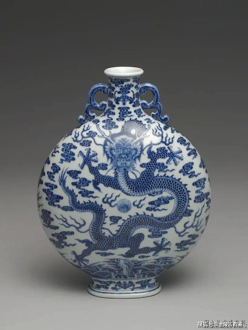 高44.5厘米,口径8厘米,底径15×11厘米。扁壶,小唇口,直颈,器腹呈扁圆形,浅圈足呈椭圆形,颈肩处饰以螭形双耳。口沿及圈足壁饰以青地白纹的海波纹样;颈饰变形蕉叶纹,肩部饰如意云头纹一周;瓶身腹部,正背两面皆饰圆形团龙云纹,外绕一圈留白。龙龙纹作正面龙形,四之四展,五爪犄张;龙身鳞片勾勒细腻,云纹穿绕隙地。满布缠枝花卉纹,近足处为一圈变形莲瓣纹。底有“大清乾隆年制”六字款。