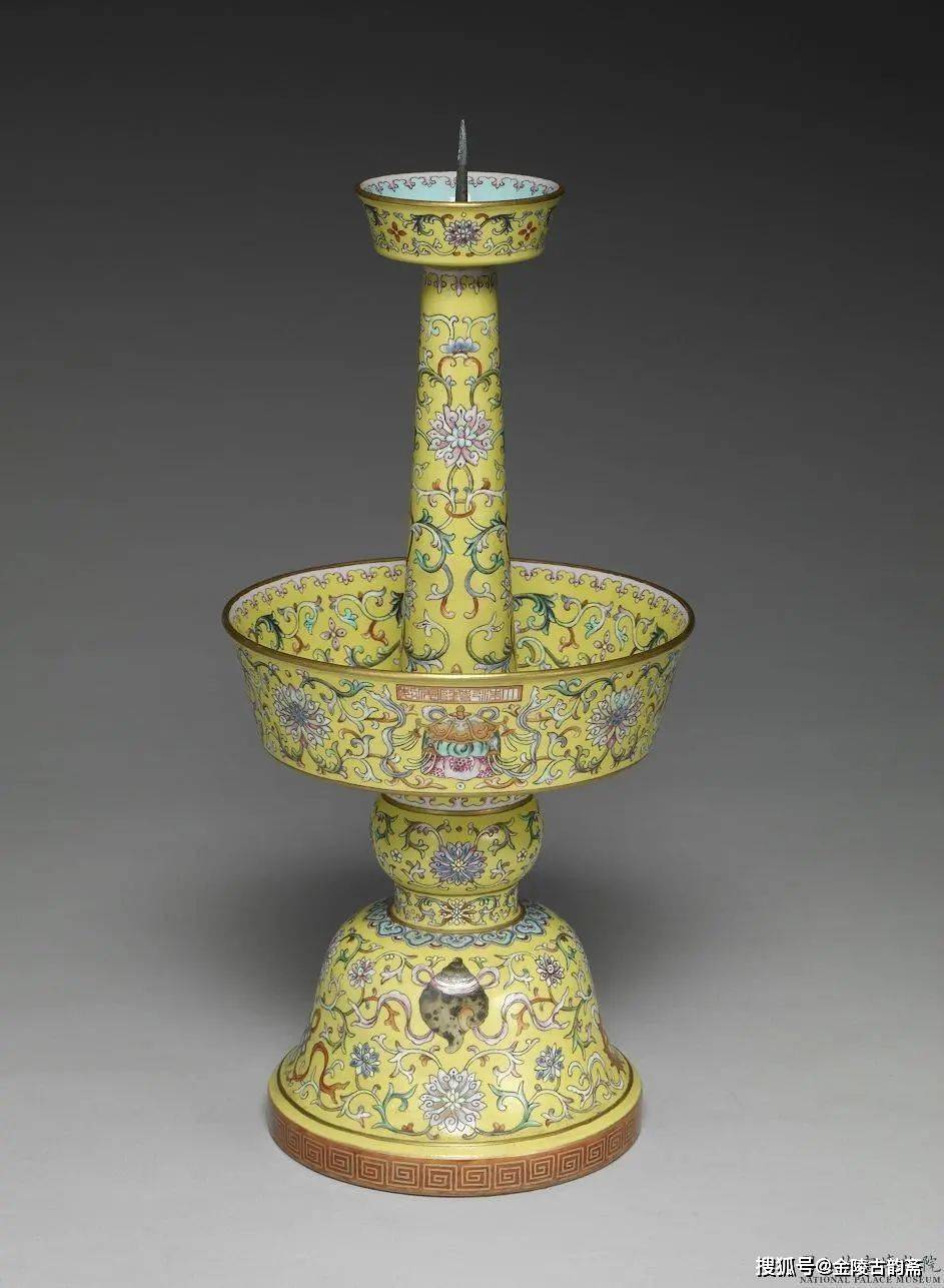 高37.6厘米,口径7.8厘米,底径15厘米。烛台,分上、下两承盘,有承柱相连。底座为覆钟式。明显可见下盘与座子之间有接缝。两部分是分开烧窑,而后连接起来。连接的方式为子母卡榫式,也就是说座子挖孔,下盘的承轴附装凸榫,套装之前以低温烧结的混合物涂抹,以使黏住永不复脱落。全器涂黄地,上绘卷枝番莲、如意勾云纹花边、及佛教八宝。下盘的外壁有描红篆款“大清乾隆年制”。款识下饰佛教八宝之一的华盖,依次是鱼、瓶、花。覆钟式的座子上为法轮、螺、盘长及伞。此外加饰如意云头、回纹等。