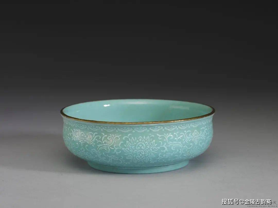 高4.7厘米,底径8.5厘米,口径13厘米。敞口碗,口缘铜扣,深弧壁外硕,圈足。整器内外满施天青色釉,细支钉痕见于底外。外壁在天青地釉上,以白釉料绘出纹样似浅浮雕的效果。口缘有如意云头纹,近足处饰莲瓣纹一圈。腹外壁等距饰盛开的番莲花叶,间饰蝠卸磬图样,有“福”、“庆”等吉祥寓意。