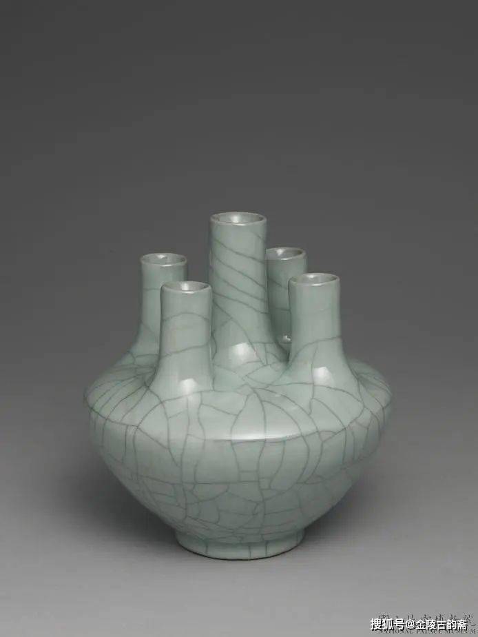 高18.8厘米,底径7.2厘米,口径3厘米。直口,长颈,平肩,敛腹,圈足。本瓶有五管,中央高,四周低,下接弧壁碗形器腹。全器施青瓷釉,布满冰裂纹。足缘露胎一圈,足内满釉,中心釉下钴蓝书“大清乾隆年制”三行六字篆款。