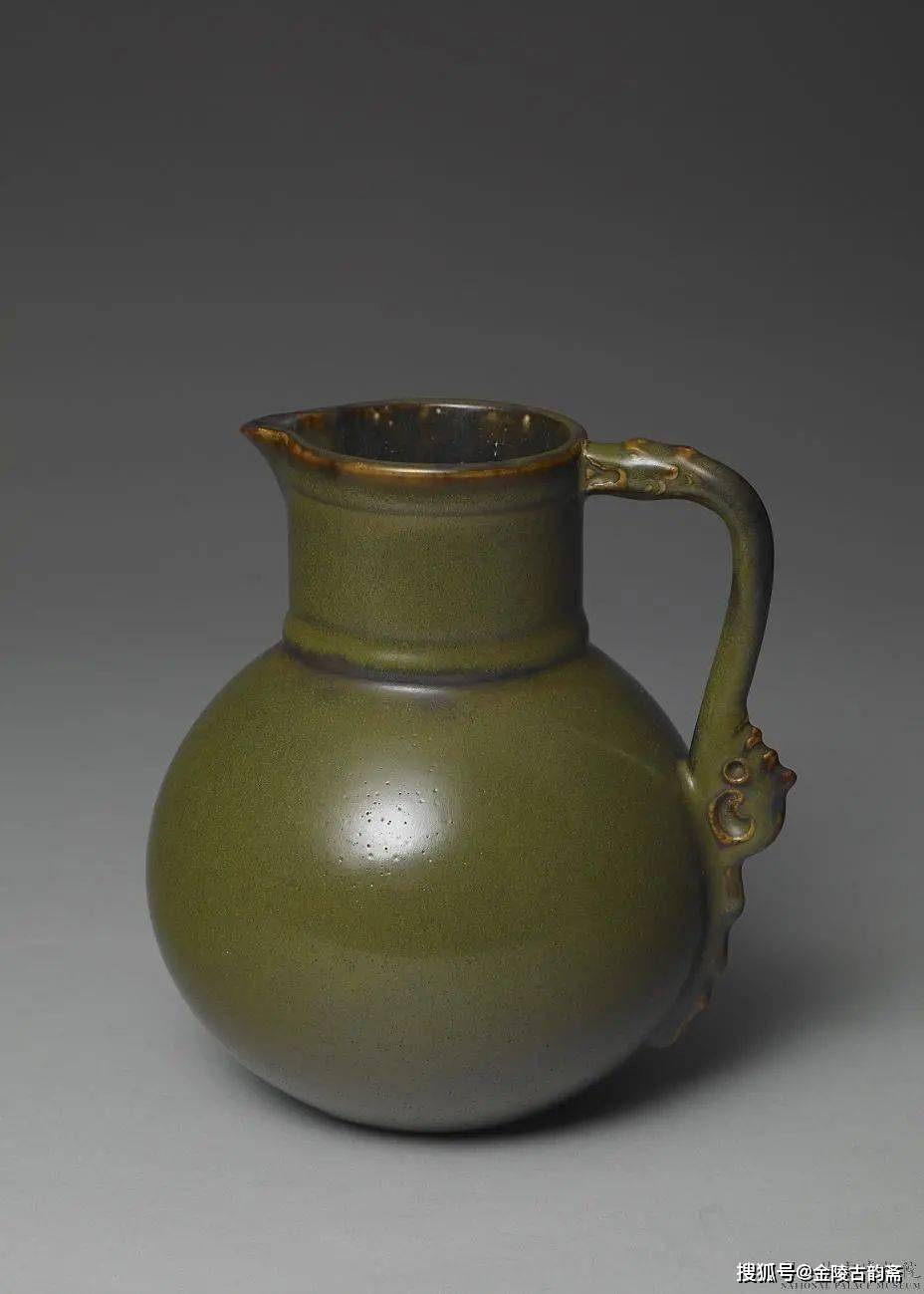 高16.7厘米,底径5.5厘米,口径8厘米。花浇圆口,周缘切平,一侧向外突出形成短尖流。短颈,圆硕腹,口腹接一道边棱,侧置一螭形把,口下划一道,定出螭首衔贴位置。底内挖成卧足,底心浅印“雍正年制”两行四字篆款。全器罩施茶叶末釉,口部釉层下流,形成褐色边。釉面清楚可见橘皮棕眼。此器祖型为西亚玉器或金属器,十五世纪明朝永乐、宣德官窑临仿之烧制成青花瓷器。由于永乐作品较常出现双首螭纹柄的造型,故以为此品当是雍正仿永乐之作。回溯明朝,因有与西亚交流的背景,因此瓷花浇的烧制,可视为是反映史实的具体例证。相对于此,雍乾两朝档案倒是出现有永宣花浇的纪录,遂让人从中推想今日将此类器皿称作花浇,当是沿袭清宫旧称。据此也能明白花浇加设出水流口的设计,或是为了进一步落实使用功能,而进行的改良。那麽始见于康熙朝的茶叶末釉加施于外,也让此品兼具仿古器形和新釉彩的特色。