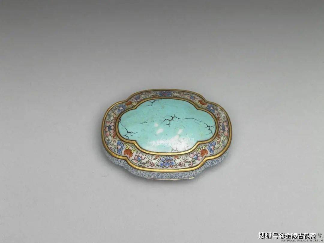 长6厘米,宽4.2厘米。瓷制带板,全器呈椭圆四瓣花形,两边微微突出。正面中央带一椭圆形开光,内施浅蓝釉为地,并以黑彩描绘裂纹。开光外缘为白地宽弦纹,绘有蓝、红、粉红各色花叶纹,弦纹周边涂敷金彩。器身侧边为白地,并满绘蓝色花叶纹。器背带圆形与椭圆形钮各一,光素无纹。