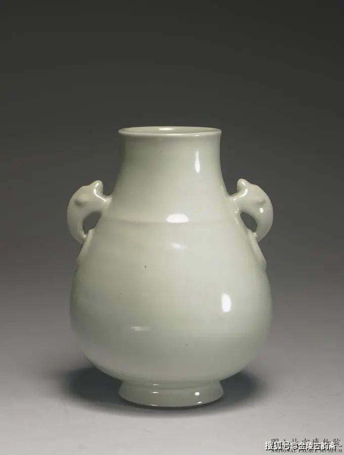 高19.6厘米,底径7.6厘米,口径7.2厘米。口略侈,短颈,削肩,异兽耳暗环,圈足外撇。颈肩处凸起一周如范接痕,除此之外光素无纹。全器施仿青瓷釉,釉凝润,呈色白灰中泛青,柔化了异兽耳较为锐利的线条。足缘露胎一圈,涂褐色汁,足内满釉青花书:“大清雍正年制”三行六字篆款。