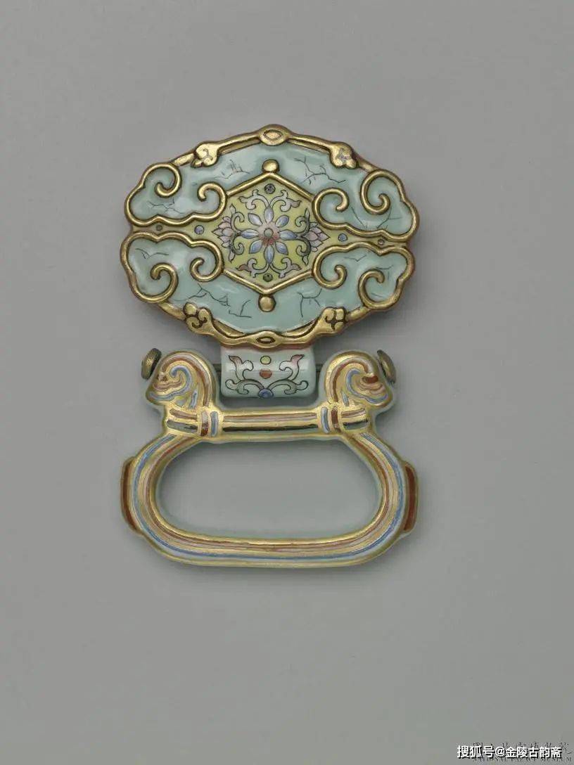 高1.8厘米,宽5.5厘米,长8厘米。瓷制带板,由两如意云头形磬图案相交,组合成近菱形形状。磬形图案周边起棱凸出,涂金彩;内施浅蓝釉为地,并以黑彩描小裂痕,仿松绿石纹理。两磬中央之开光为浅黄地,中央描绘花叶纹。带头侧边为红地,表面描绘银色花叶纹。器背施浅蓝色釉,带圆形与椭圆形钮各一,光素无纹。