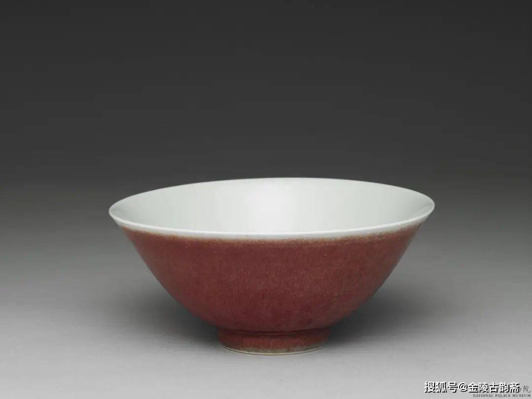 高6.7厘米,底径5.2厘米,口径15.3厘米。侈口大碗,深壁,平底,圈足。外壁罩铜红釉,釉色不匀。器内及外底施透明釉,圈足底缘露胎一圈。底书青花双圈“大清雍正年制”双行楷款。