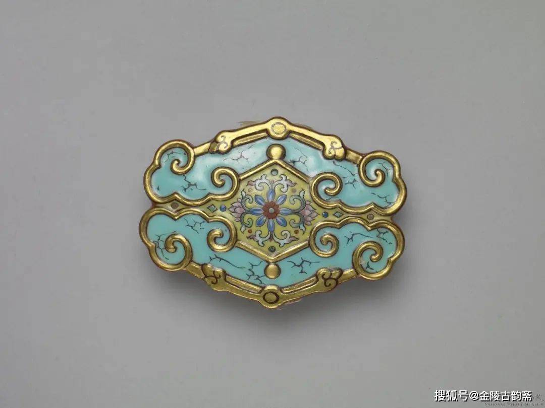 高1.6厘米,宽5.4厘米,长8厘米。瓷制带板,由两如意云头形磬图案相交,组合成近菱形形状。磬形图案周边起棱凸出,涂金彩;内施浅蓝釉为地,并以黑彩描小裂痕,仿松绿石纹理。两磬中央之开光为浅黄地,中央描绘花叶纹。带头侧边为红地,表面描绘银色花叶纹。器背施浅蓝色釉,带圆形与椭圆形钮各一,光素无纹。