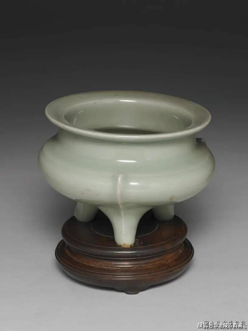 高11厘米,口径13.4厘米。取样于铜鬲造形,平口折沿,直短颈,三乳状足外撇,肩部饰一道凸弦纹,腹部与三足外侧有棱线凸起。釉色粉青无纹片,莹洁滋润,棱线处釉薄而色淡白。足底露灰胎。足端无釉微呈朱红。附圆形束腰云形足木座一只。