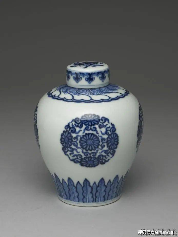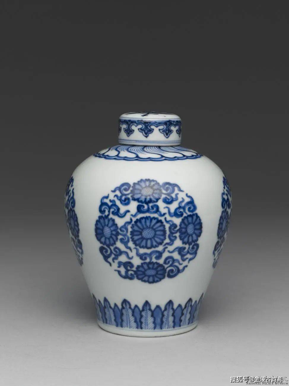 高15厘米,底径7厘米,口径3厘米。圆口,短直颈,鼓肩,硕腹下敛,平底内凹成足。外型有如上下压缩之梅瓶,附平顶圆盖。外壁以釉下钴蓝绘饰纹样,肩部绘波涛纹一圈,腹外壁等距绘团花纹,近底处蕉叶纹。器外壁所绘波涛、蕉叶,多是以重複且简单样式一再重複而成,但团花的设计则别出心裁,其以一花居中,上下左右绘一朵同类花,枝叶蔓生隙地,五花皆作正面盛开,但外围的四朵花则略成椭圆,宛如以侧视角绘写盛开花,使团花周围产生微微的空间感,再配合硕弧的外壁形式,更凸显了团花纹中央朵花的地位。盖顶面饰折枝桃实,盖侧壁如意云头纹。底外釉下青花书“大清雍正年制”双行六字楷款,外加双圈。