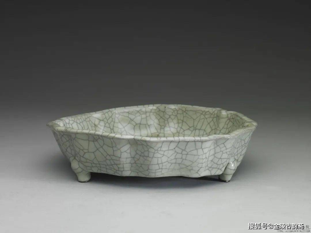 高5.4厘米,口径20.5厘米,底径17.3厘米。葵瓣形八边形洗,敞口,圆唇棱,浅壁,壁下缘收为平底,底边有棱,三兽足。全器施哥釉,釉色晶莹润泽,釉面布满黑、褐色开片纹。底有八个支钉痕围成一圈,支钉痕及足底露胎,呈铁黑色。