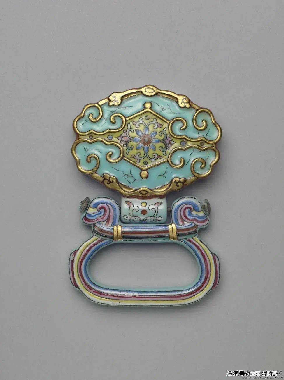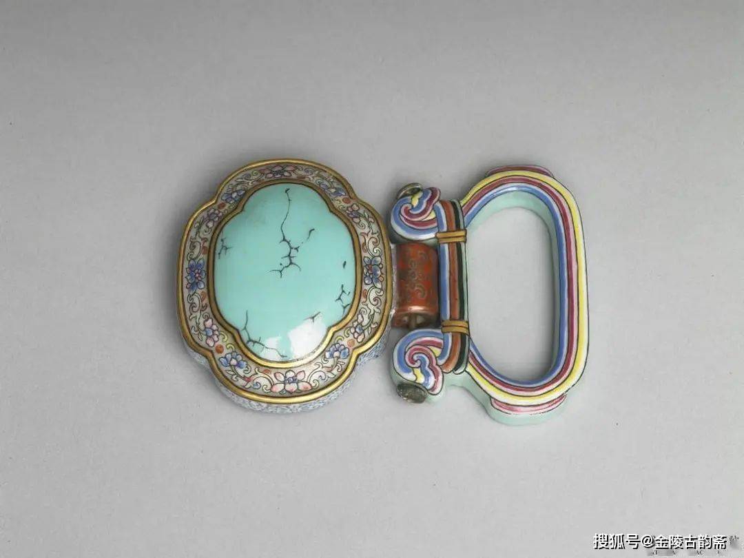 高2.2厘米,宽4.5厘米,长6.5厘米。瓷制带板,近菱形,由两如意云头形磬组合而成。磬形图案周边起棱凸出,涂金彩;内施浅蓝釉为地,并以黑彩描小裂痕,仿松绿石纹理。两磬中央之开光为浅黄地,中央描绘花叶纹。带板一侧接一中空长管,以横贯而过的金属长钉连接一椭圆瓷环。应为腰带上的带板,瓷环用以悬挂下垂的随身佩物。环身表面满绘红、黄、蓝各色条纹。带板侧边为红地,并于表面描绘银色花叶纹。器背略凹陷,中央带一长方框,光素无纹。