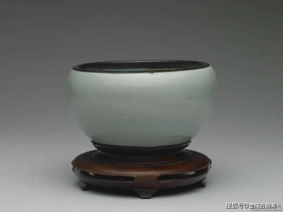 高9.1厘米,口径14.5厘米。器作矮钵形,圆口内敛,镶铜扣,圆腹深壁,下收为圆弧底。通体施仿汝青釉,洁净光润,色泽淡雅,平素无纹,釉面有浅色开片纹,内壁器底有烧造痕。附圆形木托座一。
