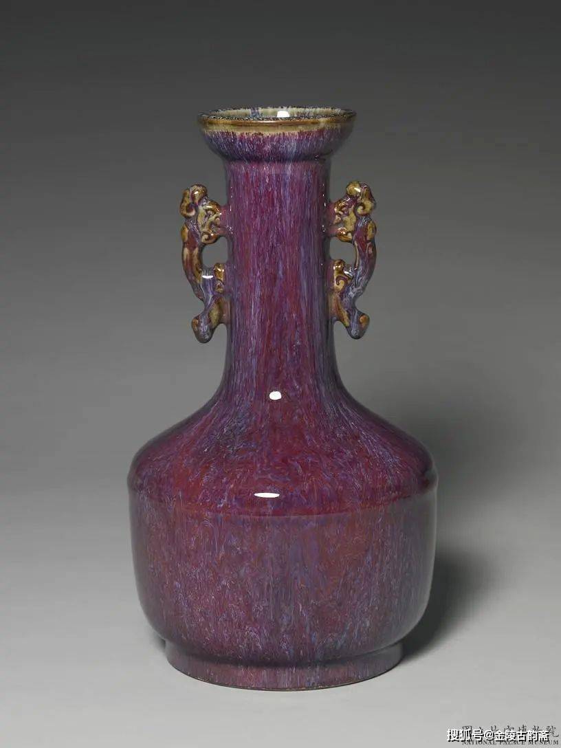 高26.7厘米,底径11.8厘米,口径7.5厘米。盘形口,长颈,颈两侧装饰二螭形耳,斜肩,硕腹,平底,矮圈足。器内外皆罩施紫红和天蓝相间的仿钧釉,口沿及螭形耳釉薄处出现浅褐色釉斑。底部亦施褐色釉,釉层不匀,底心刻“雍正年制”两行篆款。对照唐英〈陶成纪事碑〉,此品或是仿钧釉项下所包含的“新紫”或“茄花紫”一类的釉彩。