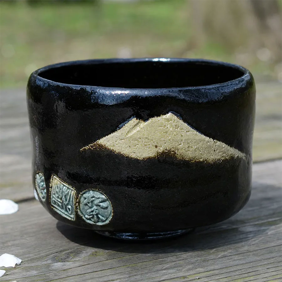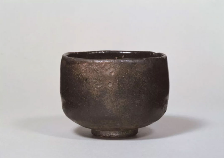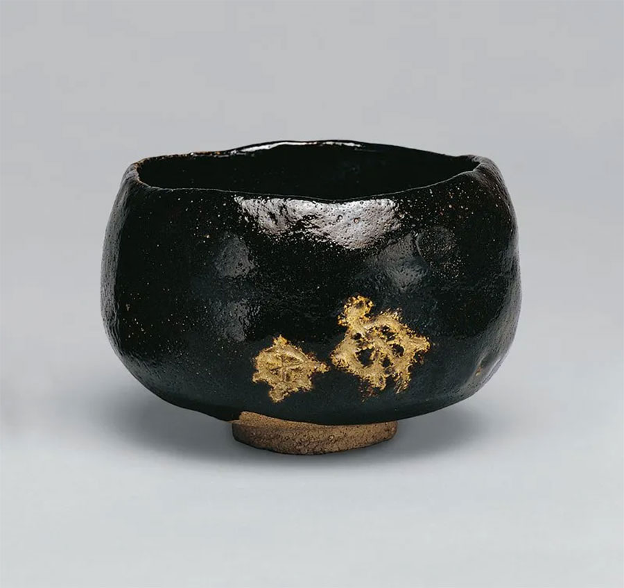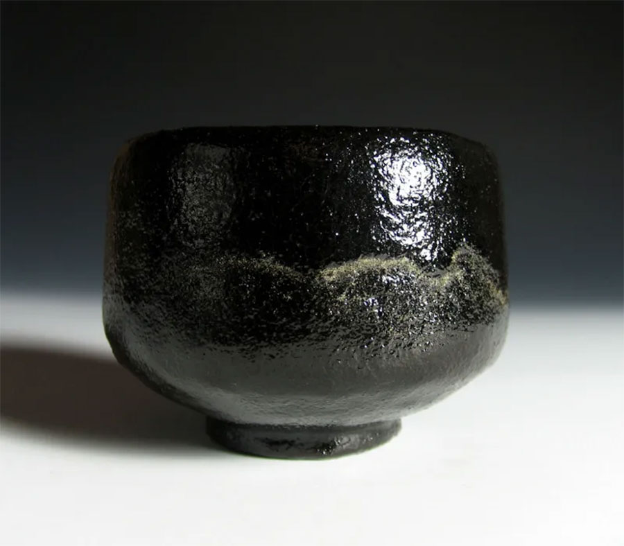 2)黑乐茶碗是长次郎借鉴了建州黑釉的配方,用京都加贺川的真黑石粉末加入釉药,以近一千两百度高温烧制,火钳取出冷却,最后呈现为黑色。“黑乐”这种朴素的感觉最能表现出茶圣利休所追求的茶道境界。