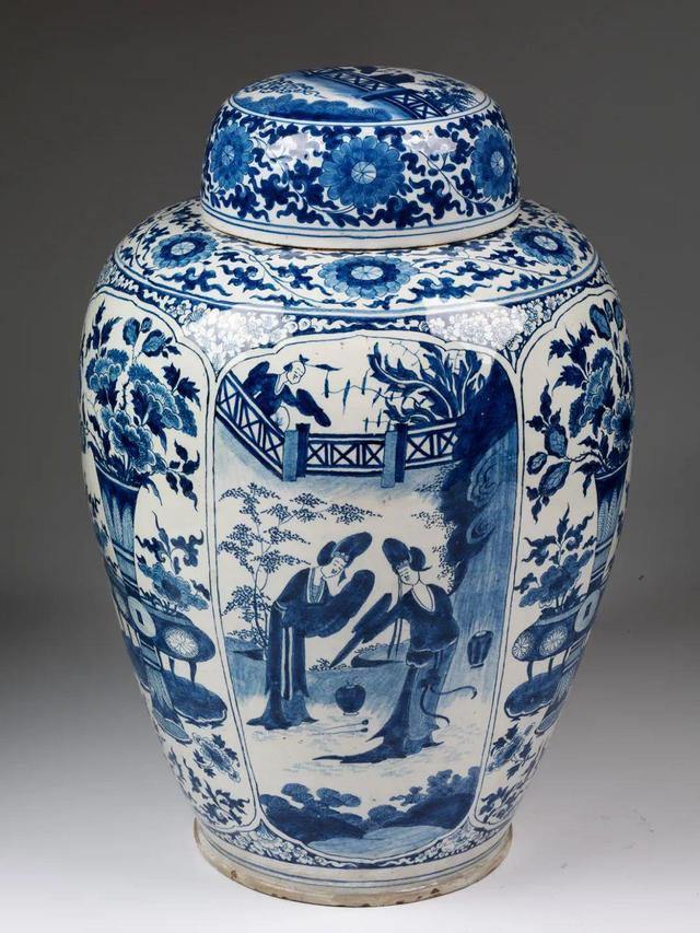 威廉·卡尔夫,巴洛克时期的荷兰画家,出生于鹿特丹,是荷兰黄金时代最杰出的静物画家之一。此画描绘了一张堆满物品的桌子,其中有一件青花盖碗。可能用作糖罐,碗盖斜搁在碗和水果上,有一形似蹲狮的深色盖钮。碗外壁开光内贴塑两个着色的中国人物形象,一说是八仙中的吕洞宾与何仙姑。