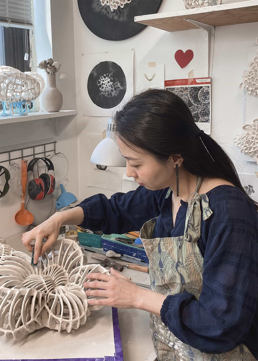 我的雕塑会展现出脆弱/坚硬,简单/复杂,秩序/乱序,规则/不规则,坚硬/柔软这些对立的特质,想要表现微观世界这些生命体简洁多变的形态以及它们精巧的结构美感,让观众能感受到那个隐藏着的另一个世界。《生长和形态》一书中,“物体的形态像图表一样展示了相互作用的各种力”。我感兴趣的这些生物结构,记录了它们在生长、扩张、消亡过程中受到自身的生长力,同时和外界空间、环境和时间所形成的外力的相互影响。一直适应、改变、进化出无限的新形态。微生物作为最基本的生命体也是高级生物的缩影。通过创作我思考生命的生长状态,微观和宏观世界,思考自己的经历,将自己日常的观察和感受,加上一部分的想象,编织到作品抽象的线条当中。在美国待的时间越长,越会慢慢明白自己拥有的中国文化背景的可贵和独特。在作品里添加一些元素,比如用中国陶艺传统的色调,例如青花的蓝和白,青釉的绿,展现对自己的身份认同。