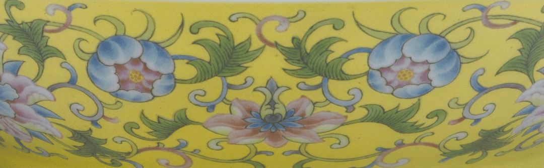 这件盘侈口、深弧壁、矮圈足。器内平素无纹,器外壁施黄地,并以红、黄、蓝、绿等色描绘较为规整、图案化的缠枝番莲花纹为饰,器底带「雍正年制」二行蓝料宋体字双方框款。对照康熙朝铜胎画珐琅,呈现出跨质材袭仿的特色。