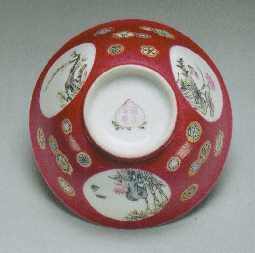 这二件碗侈口、弧壁、 矮圈足。器内壁模印莲池纹,碗心且带有「永乐年 制」二行四字模印篆款。外壁满施红地,红地上装饰团花图样,并有三个白地圆形开光。开光内分别绘有「瑶琳仙境」、「竹枝双鹊」 、「福禄寿喜」的吉祥图案。器底绘寿桃,内有「雍正年 制」二行红料楷书款。