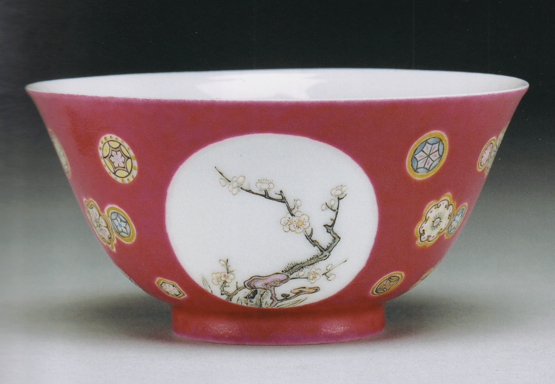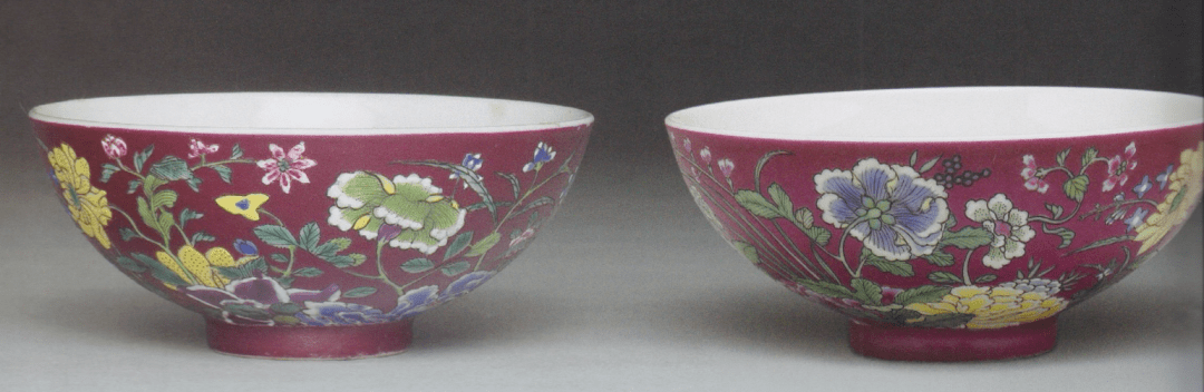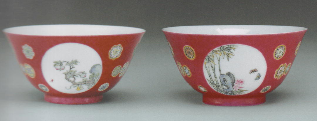 清 雍正 珐琅彩瓷红地团花开光花鸟碗二件