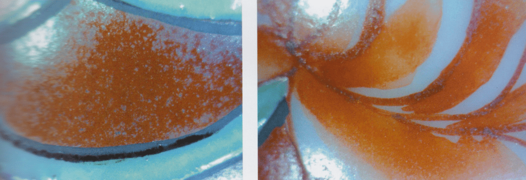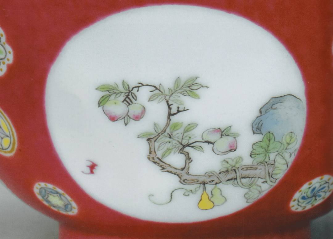 经显微放大五十倍后,清楚可见团花以烧金珐琅框边,团花内部可见涩胎裸露。红色地多坑洞,亦说明探涩胎上施红料的做法。粉色灵芝以金红玻璃裂成珐琅料上彩,在显微放大两百倍下,可分别观察到未熔解的红玻璃颗粒与金微米颗粒。