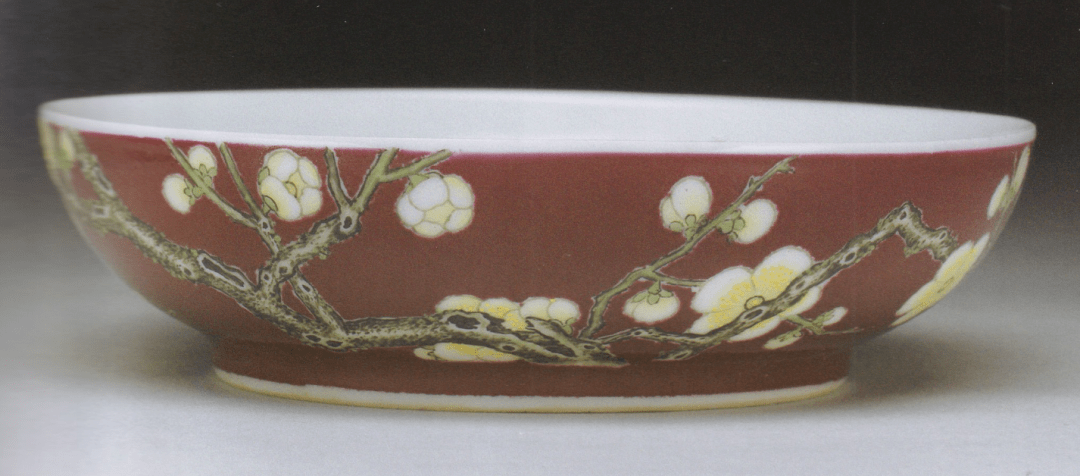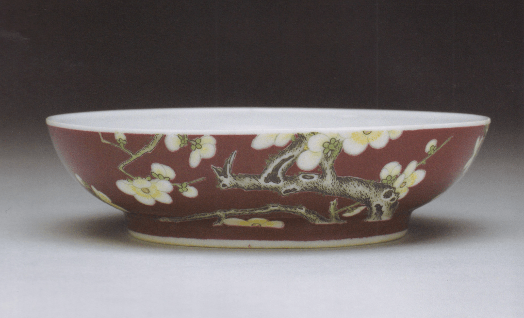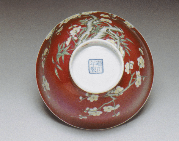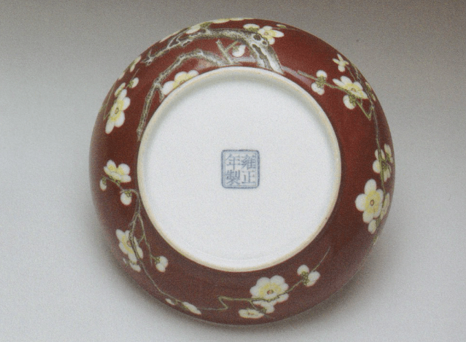 这对碟敛口、浅弧壁、矮圈足。器内平素无纹,器外壁施红地,其上绘梅树一枝,并满开白梅花。器底带「雍正年制」二行蓝料宋体字双方框款。