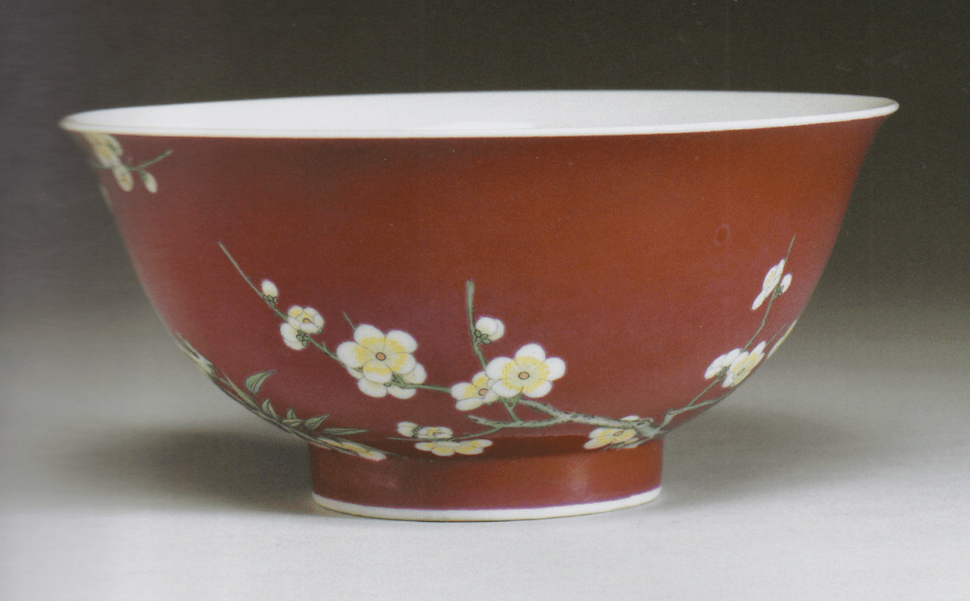 清 雍正 珐琅彩瓷红地梅竹先春碗一对