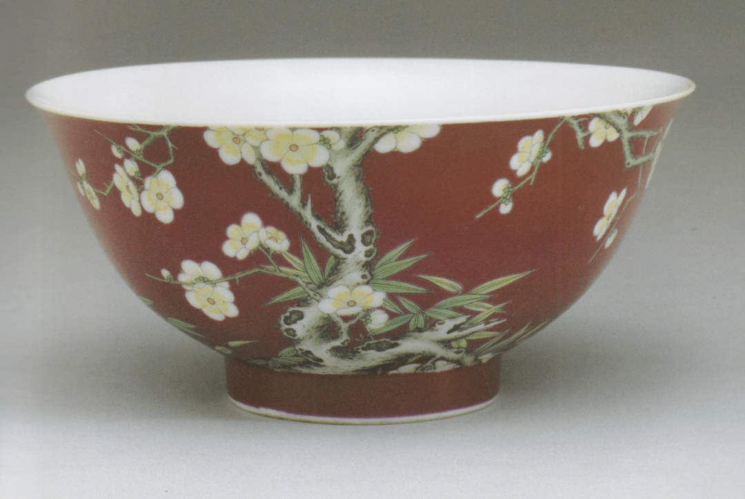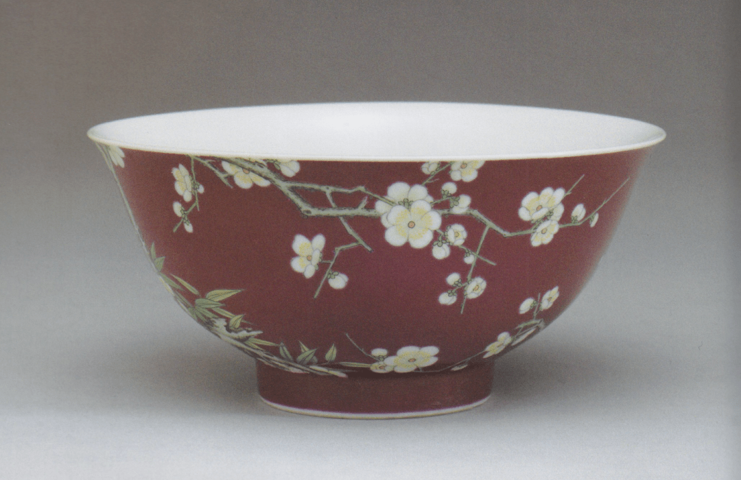 这对碗侈口、深弧壁、矮圈足。器内平素无纹,外壁满施洋红地,并于其上彩绘梅树一株,枝干苍劲,其上满开白色梅花。树后另有低矮翠竹数枝。器底带「雍正年制」二行蓝料宋体字双方框款。