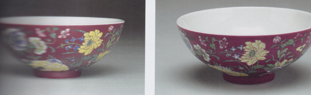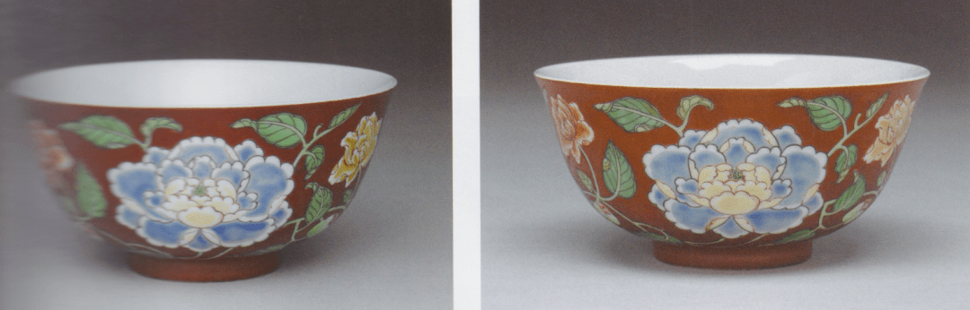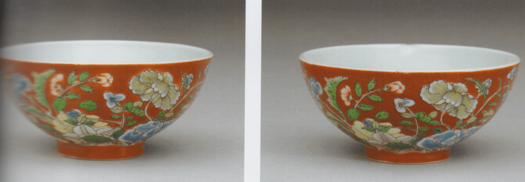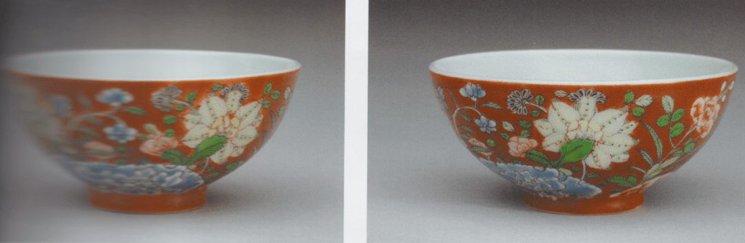这两件碗侈口、浅弧壁、矮圈足。器内平素无在”外壁以红色乌地,彩绘三朵内红外蓝的番莲花,王朵之间并间饰白、绿卷草。器底带「雍正御制」二行青花楷书双方框款。