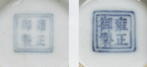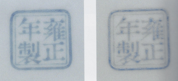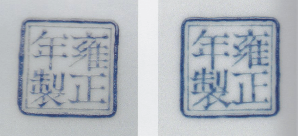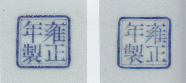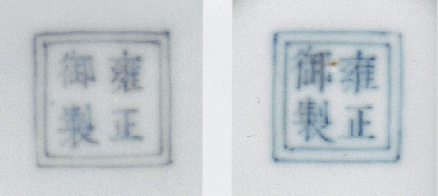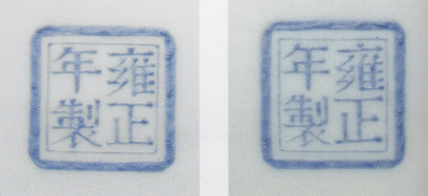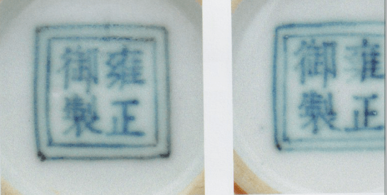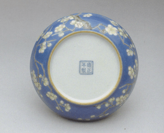 这对碟侈口、浅弧壁、矮圈足。器内平素无纹,釉色略带灰黄。二碟器外璧以蓝色马地,彩绘梅树一株,其上开满白梅。器底带「雍正年制」二行蓝料宋体字双方框款。