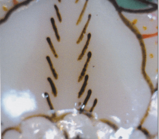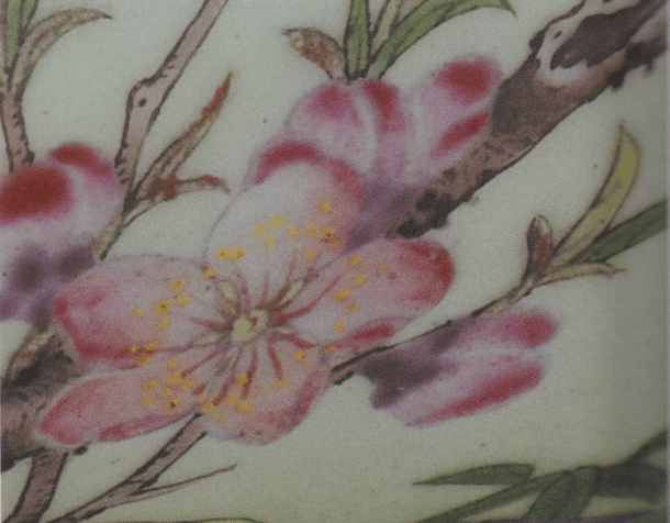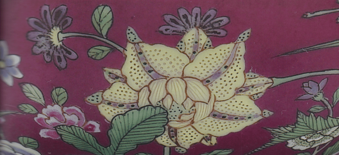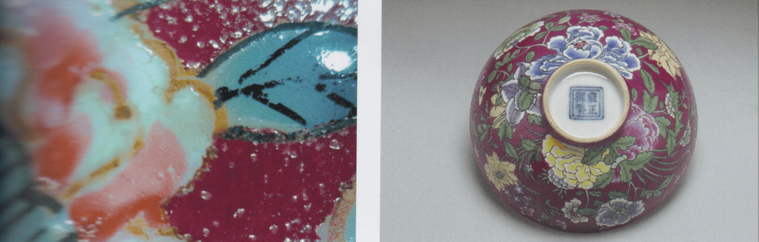 经显微放大五十倍后,可观测到红地与紫花花瓣间隔处明显露出下层涩胎而红花瓣则探先上白彩再施红彩的做法。