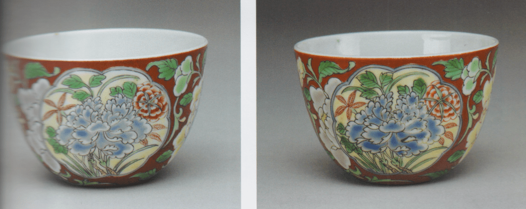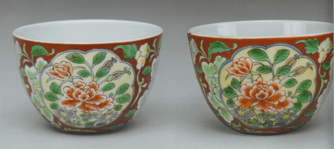 这对杯子敞口、深腹、平底、浅挖足。器内平素无纹,外壁以红色乌地,间饰三个八花口开光,开光内以 淡黄色乌地,分别绘以折枝牡丹、二色菊花和月季雏菊,开光之间并间饰黄、 绿、紫各色花朵。器底带「雍正御制」二行青花楷书双方框款。