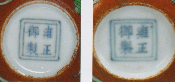 这对杯子敛口、深腹、矮圈足。器内平素无纹,外壁以红色乌地,彩绘四季花卉。花朵怖局与中瓷602、 1264二件极马相同。器底带「 雍正御制」二行青花楷书双方框款。