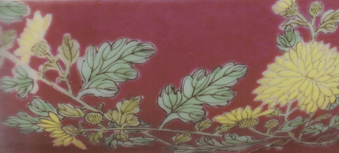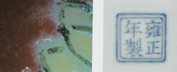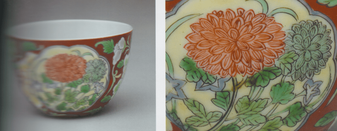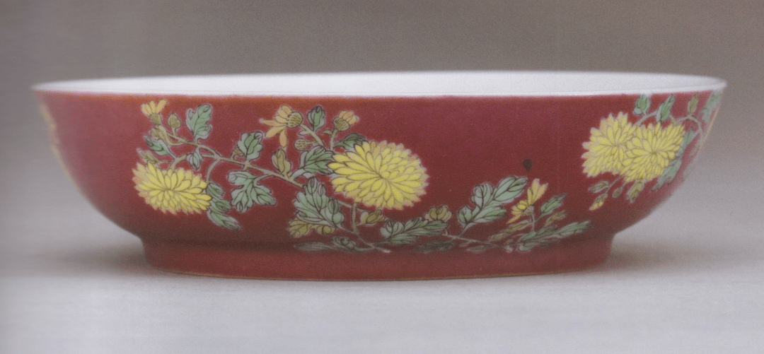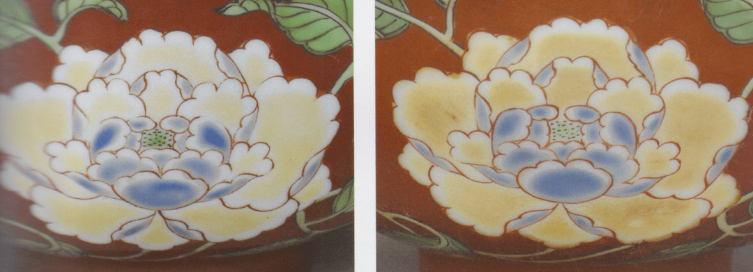 经显微放大两百倍后,可观测到此红地具厚度,有亮感,并在红地与菊花花瓣间隔处明显露出下层乌涩胎。