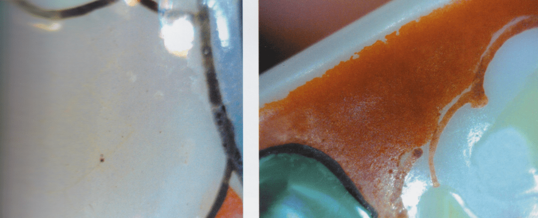 经显微放大五十倍后,可观察到红花瓣探先上白彩再施红彩的做法,红地虽具玻璃光泽但多孔洞,显示其施于涩胎。