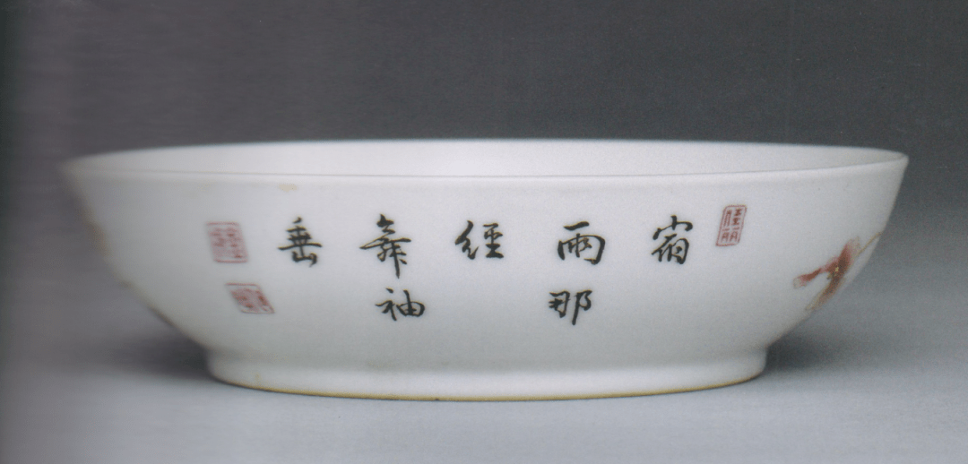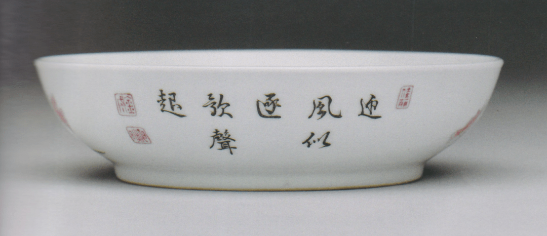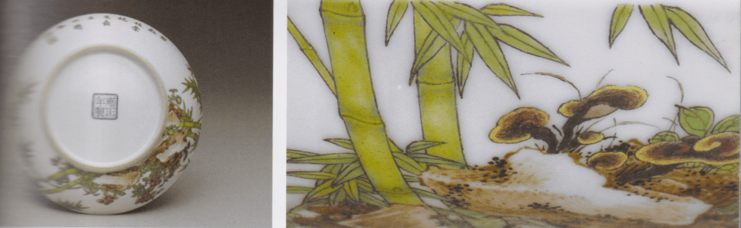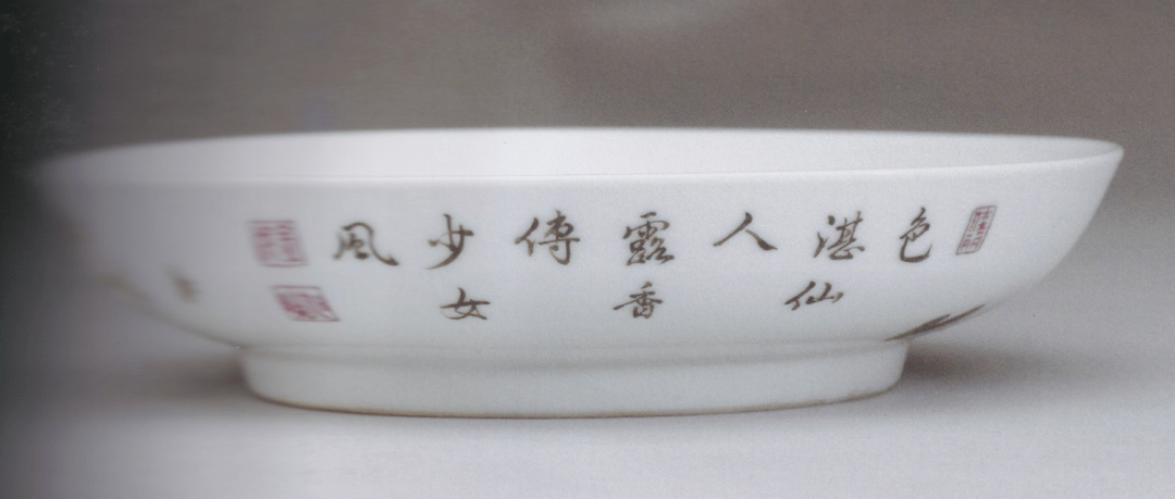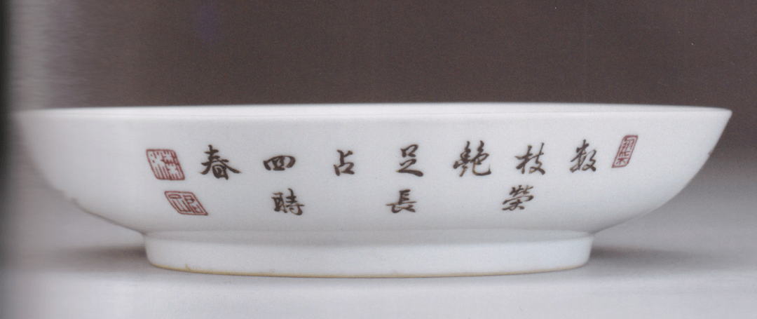 这对碟敛口、浅弧壁、矮圈足。器内平素无纹,二碟器外壁一面以赭墨绘湖石,四周并有竹、月季花、灵芝及野菊。外壁另-面以墨书写有「数枝荣艷足,长占四时春」诗句,其中前一句取自宋朝韩琦《月季花》一 诗,后一句则摘自明朝张新《月季花》七言绝句的尾句。诗句前有「凤采」, 后有「彬然」(白文)、「君子」共三枚红料印。器底带「雍正年制」二行蓝料宋体字双方框款。