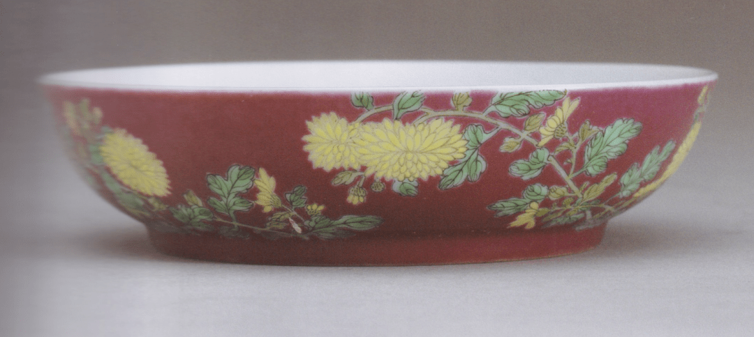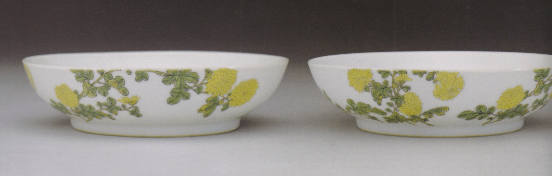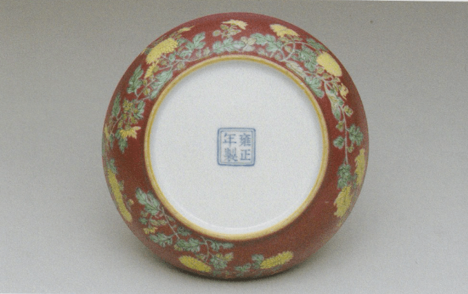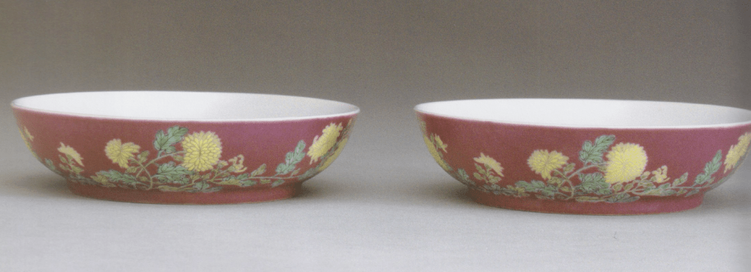 这对碟 敛口、浅弧壁、 矮圈足。器内平素无纹,二碟器外壁施洋红地,各自彩绘带着深浅不同绿叶的二丛折枝黄菊花,二碟的布局几乎完全相同,器底带「雍正年制」二行蓝料宋体字双方框款。
